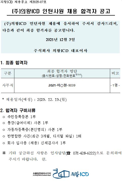 (주)의왕ICD 인턴사원 서류전형 합격자 및 인적성검사 공고