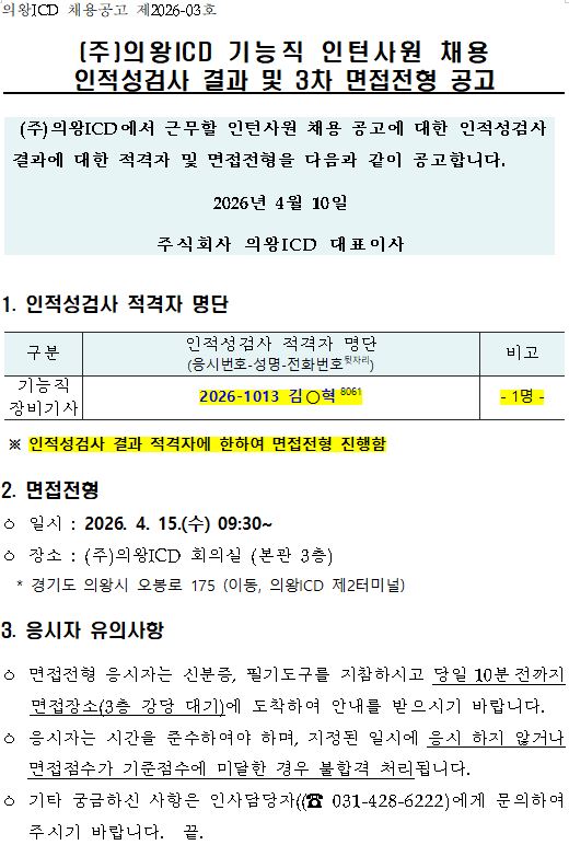 (주)의왕ICD 기능직 인턴사원 채용 인적성검사 결과 및 3차 면접전형 공고